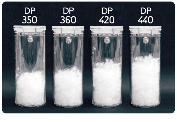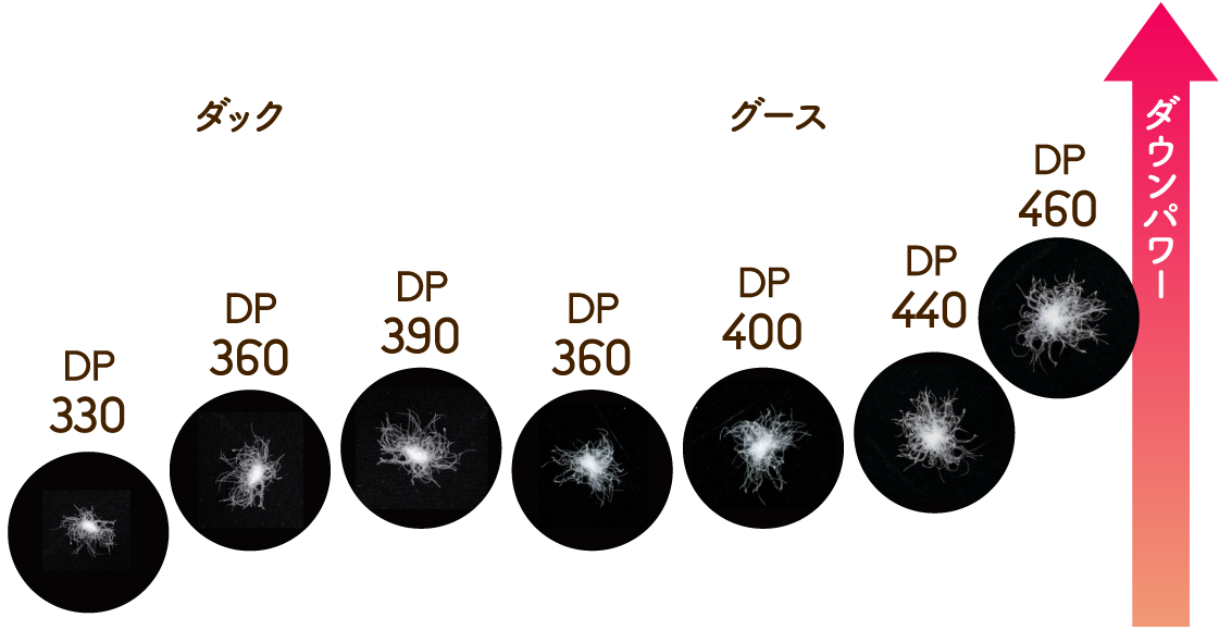 同じグラム数でも、ダウンパワーの違いでこんなにもかさ高が違ってきます。ダウンパワーが高いほど、空気を多く含みふっくら暖かです。