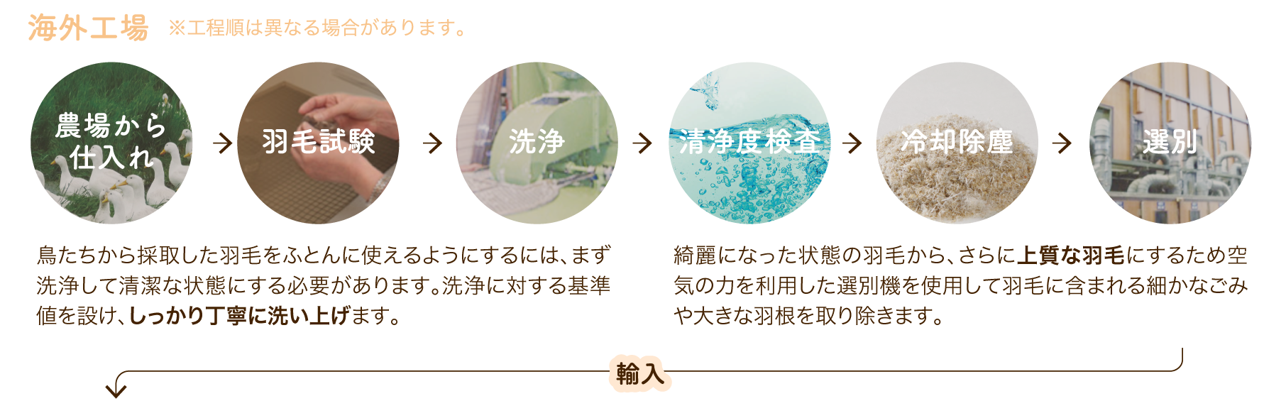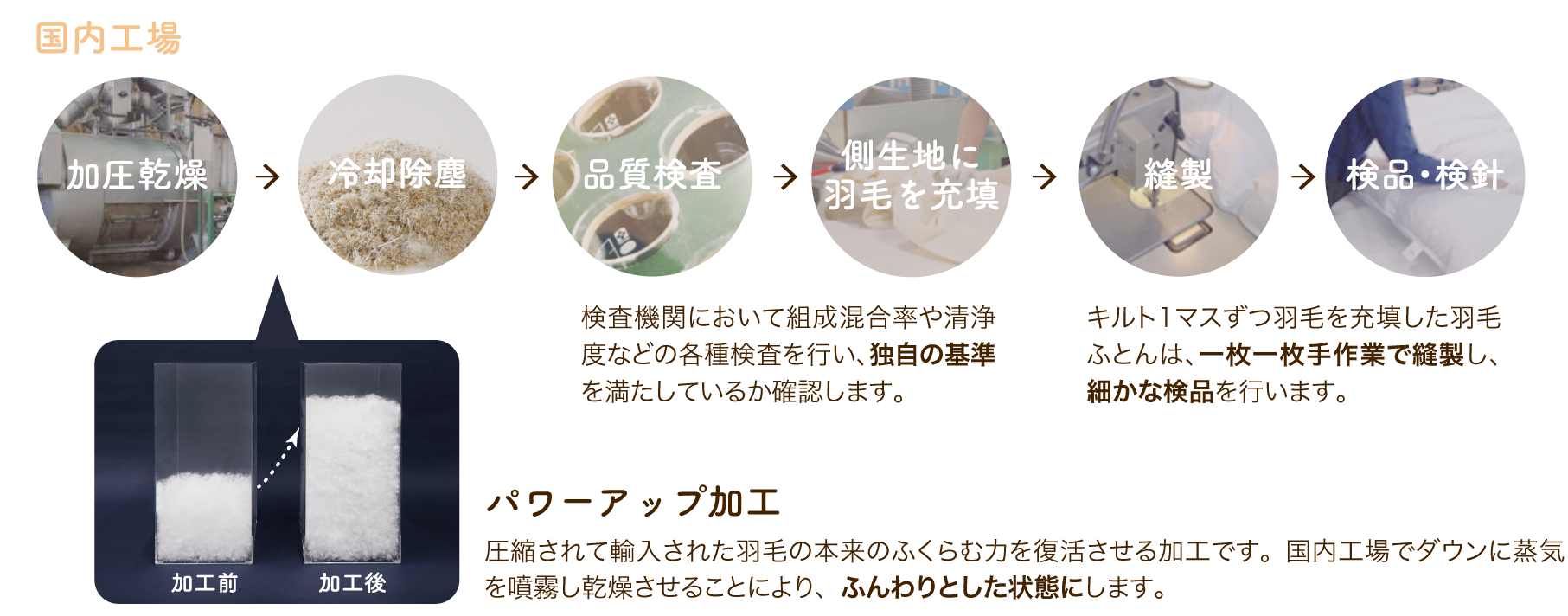 厳しいチェック項目を満たした指定の国内工場にて生産しています。また、使用する原料すべてに国内工場でパワーアップ加工またはダブルアップ加工などの、輸入時に圧縮された羽毛を最適な状態に戻す加工を行なっています。