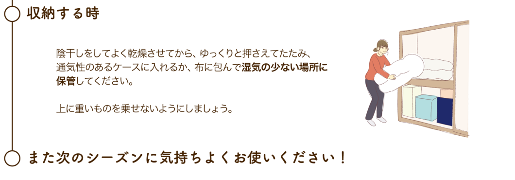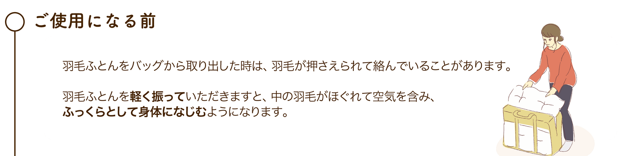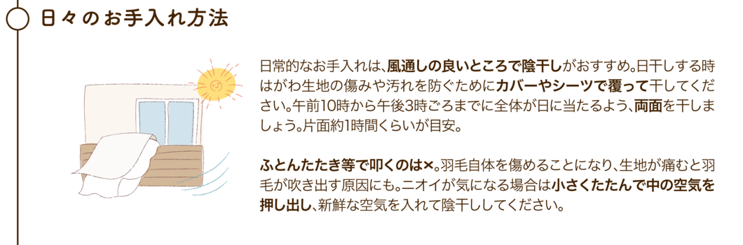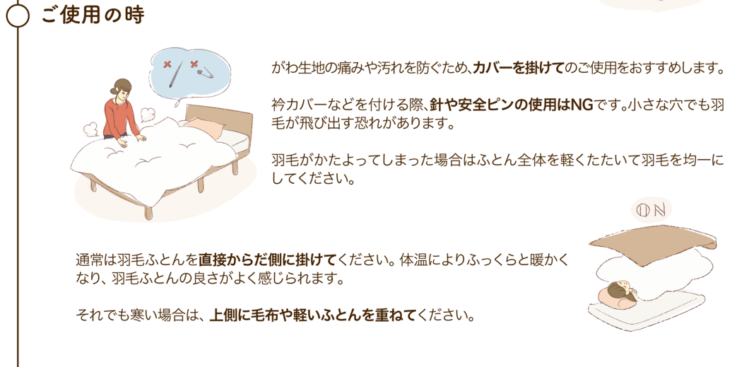 羽毛ふとんは適切に取り扱うと、長く気持ちよく使い続けることができます。より上手にお使い頂くための方法をご紹介しますので、ぜひ参考にしてください。