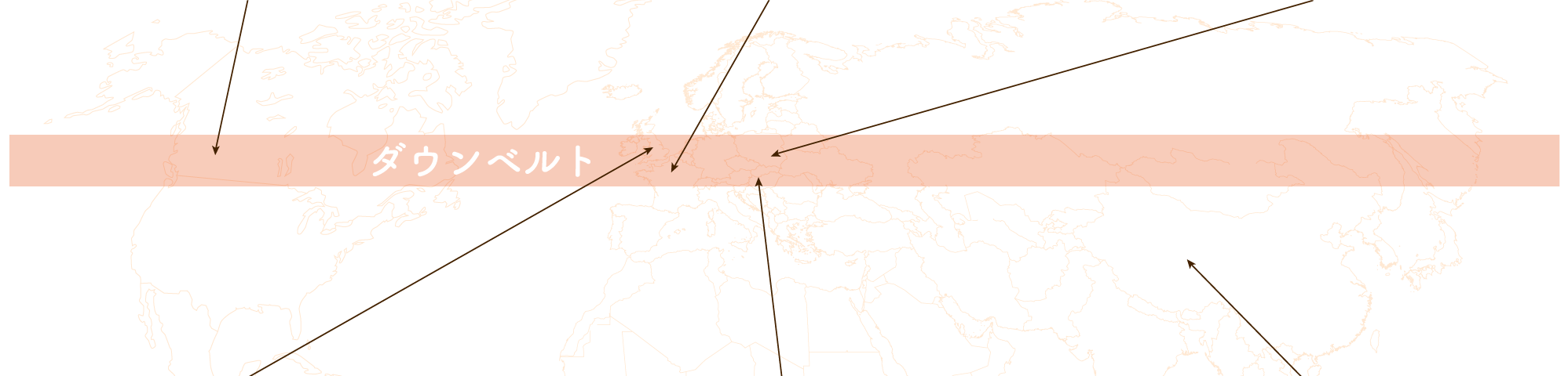 北緯45〜53度の地域を 「ダウンベルト」と呼びます。この地域は寒暖の差が非常に激しいエリアのため、この地域に生息する水鳥は、 この寒さに耐えるために良質な羽毛をそなえているといわれています。